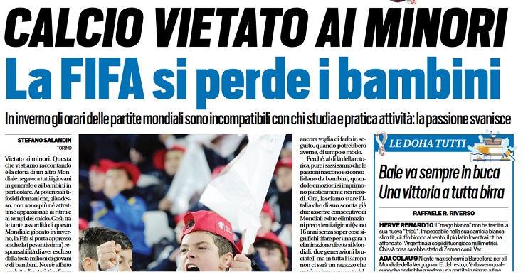Tuttosport: “Qatar 2022, calcio vietato ai minori: la Fifa si sta perdendo i bambini”