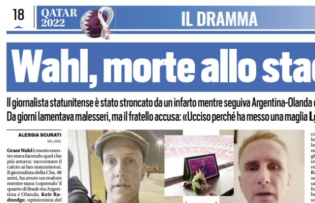Tuttosport: “Qatar 2022. Il dramma Wahl, morte allo stadio. Da giorni lamentava malesseri, ma il fratello accusa: «Ucciso perché ha messo una maglia Lgbtq+ per me»”