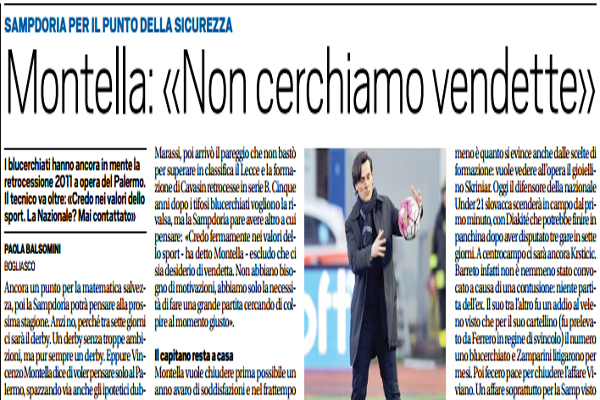 “Ancora un punto per la matematica salvezza, poi la Sampdoria potrà pensare alla prossima stagione. Anzi no, perché tra sette giorni ci sarà il derby. Un derby senza troppe ambizioni, ma pur sempre un derby. Eppure Vincenzo Montella dice di voler pensare solo al Palermo, spazzando via anche gli ipotetici dubbi sulla sua permanenza alla Sampdoria. C’è ancora quel punto che manca e che i blucerchiati vogliono portare a casa questo pomeriggio senza ripensare a quel famigerato 2011, quando i rosanero non si giocavano più nulla mentre la squadra ligure lottava per la salvezza. Miccoli alla fine del primo tempo gelò Marassi, poi arrivò il pareggio che non bastò per superare in classifica il Lecce e la formazione di Cavasin retrocesse in serie B. Cinque anni dopo i tifosi blucerchiati vogliono la rivalsa, ma la Sampdoria pare avere altro a cui pensare: «Credo fermamente nei valori dello sport – ha detto Montella – escludo che ci sia desiderio di vendetta. Non abbiano bisogno di motivazioni, abbiamo solo la necessità di fare una grande partita cercando di colpire al momento giusto». Il capitano resta a casa Montella vuole chiudere prima possibile un anno avaro di soddisfazioni e nel frattempo inizia a programmare la prossima stagione: «Con la società c’è sintonia, sia nel pubblico sia nel privato, quello che ho da dire al club lo dico, l’importante è essere chiari e leali con chi ti dà uno stipendio. La Nazionale? Personalmente non sono stato mai contattato». Insomma, Montella pensa solo alla Samp. Questo almeno è quanto si evince anche dalle scelte di formazione: vuole vedere all’opera il gioiellino Skriniar. Oggi il difensore della nazionale Under 21 slovacca scenderà in campo dal primo minuto, con Diakité che potrebbe finire in panchina dopo aver disputato tre gare in sette giorni. A centrocampo ci sarà ancora Krsticic. Barreto infatti non è nemmeno stato convocato a causa di una contusione: niente partita dell’ex. Il suo tra l’altro fu un addio al veleno visto che per il suo cartellino (fu prelevato da Ferrero in regine di svincolo) il numero uno blucerchiato e Zamparini litigarono per mesi. Poi fecero pace per chiudere l’affare Viviano. Un affare soprattutto per la Samp visto che adesso il portiere sogna l’azzurro. Con uno sponsor d’eccezione: «Emiliano alla Samp ha dimostrato di aver trovato l’alchimia, disputando due ottime stagioni – ha chiosato Montella – Conte segue tantissimo la Samp. Se dipendesse da me però io una spinta gliela darei, soprattutto per come ha giocato recentemente»”. Questo quanto si legge sull’edizione odierna di “Tuttosport”.