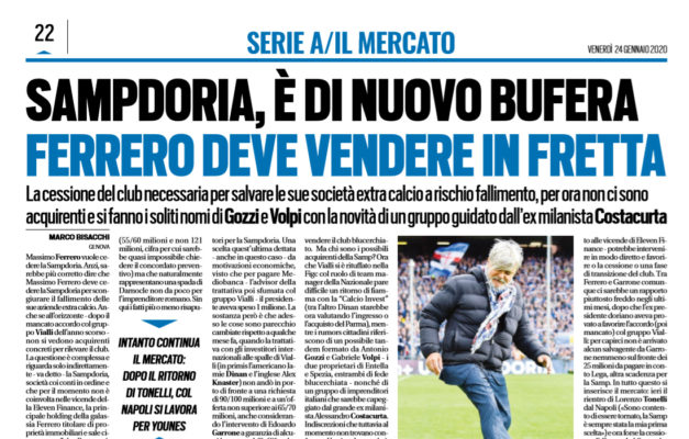 Tuttosport: “Sampdoria, è di nuovo bufera. Ferrero deve vendere in fretta”