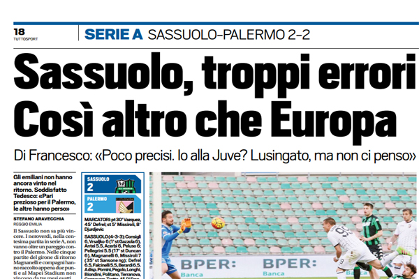 Tuttosport: “Sassuolo, troppi errori. Così altro che Europa. Palermo punto pesantissimo”
