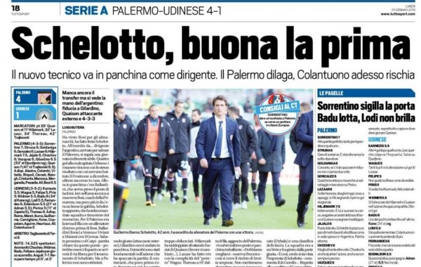 L’edizione odierna di “Tuttosport” analizza il match vinto contro l’Udinese con Schelotto alla guida, sotto mentite spoglie. Ecco quanto si legge: “Ha vinto Bosi per gli almanacchi, ha fatto festa Schelotto. All’esordio da…dirigente l’argentino arrivato per salvare il Palermo si regala una giornata indimenticabile. Quattro gol alla malcapitata Udinese: i rosanero vincono con lo stesso risultato con cui avevano battuto il Frosinone, l’ultimo successo in casa. Per il Palermo è stata la terza gara di fila con un allenatore diverso. Sabato prossimo a Carpi potrebbe esserci il quarto se arriva il via libera per il tesseramento di Schelotto […]“.