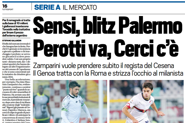 Tuttosport: “Sensi, blitz Palermo. Perotti va, Cerci c’è” – il punto sul calciomercato della serie A