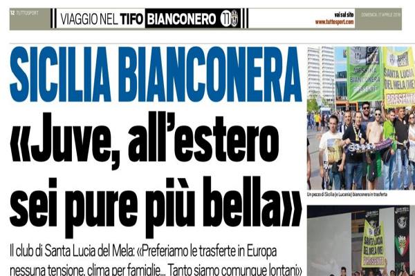 «All’estero è diverso. All’estero è più bello». I soci dello Juventus Club di Santa lucia del Mela non hanno dubbi: «Altro clima, altra gioia nel godersi la partita. A Napoli, quando ancora era permessa la trasferta a Napoli, siamo andati con un autobus scortato da quattro blindati. A Dortmund dopo la partita eravamo in birreria a brindare con i tifosi avversari. A Roma si rischia sempre la propria incolumità. A Madrid, dopo che avevano perso una semifinale di Champions, i tifosi del Real chiacchieravano con noi nei ristoranti del centro, senza il minimo di tensione… Spiace ammetterlo, ma all’estero sanno godersi il calcio molto di più di noi in ltalia». Tant’è che quando possono quelli di Santa lucia del Mela non si perdono una trasferta di coppa e dalla Sicilia volano in Europa, al seguito della Juventus. « Magari si soffre molto in finale, ma quella è un’altra storia», sbuffa il presidente del dub, Benedetto Merulla. Santa Lucia del Mela è uno dei tantissimi Juventus Club della Sicilia, isola bianconera per eccellenza, dove tifare bianconero non è complicato come in altre parti d’Italia: Le tensioni sono molto rare e nessuno ci rinfaccia la nostra fede come un tradimento nei confronti del territorio. Siamo orgogliosamente siciliani e altrettanto orgogliosamente tifosi della Juventus. Le due cose non sono incompatibili come pensano altrove», spiega sempre Merolla il problema, semmai, è la distanza. E solo a menzionarla, il sospiro dei tifosi bianconeri siciliani è lungo come i 1.400 chilometri che dividono lo Stadium dalla loro sede «E’ sempre diflici- le organizzare le trasferte, ma a Torino c’è sempre qualcuno dei nostri soci. Quando esco no anticipi e posticipi scatta l’organizzazione con gli aerei, per riuscire a prendere le occasioni migliori con le compagnie low cost. Il programma poi può prevedere una notte in bianco.. Per esempio dopo una notturna: si cena a Torino, si riprende il pullmino noleggiato al mattino e si torna a Malpensa a prendere il primo aereo per Catania. E dura, ma per la Juventus si può fare!» […]”. Questo quanto si legge sull’edizione odierna di “Tuttosport”.