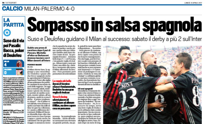 “Il Milan ritrova Suso, lo aggiunge a uno straordinario Deulofeu e grazie alle due frecce spagnole mette ko agevolmente il Palermo, superando l’Inter alla vigilia di una settimana che potrebbe cambiare la sua storia e le sorti della stagione. Da oggi fino a venerdì, infatti, inizieranno i giorni che dovranno portare al cambio societario, mentre sabato, all’ora di pranzo, andrà in scena il derby – il primo totalmente cinese? – che il Milan vivrà dall’alto verso il basso rispetto a un’Inter che nelle ultime tre gare ha collezionato 1 punto a differenza dei 7 rossoneri. Il Milan di Vincenzo Montella dopo oltre due mesi torna in zona Europa League e, grazie anche un calendario che da qui a fine maggio si annuncia meno complicato degli avversari, può davvero sognare il ritorno nelle coppe europee dopo tre stagioni di assenza. Il vantaggio sull’Inter, da confermare o migliorare nel derby, è ora di 2 punti, ma soprattutto si è allontanata la Fiorentina, ora distante 5 lunghezze senza contare che l’Atalanta, quinta, è a soli 2 punti e la prossima settimana sarà in trasferta all’Olimpico contro la Roma. «Io voglio arrivare in Europa – ha tuonato Montella dopo la vittoria di ieri -. Penso proprio che possiamo qualificarci, ero ottimista prima della partita col Pescara e lo sono di più adesso. La lotta rimane comunque dura e ardua». Verso il derby Il Milan ieri, grazie anche al gol dell’1-0 di Suso su punizione dopo sei minuti, si è di fatto allenato contro un Palermo che non è parso combattivo come la sua classifica richiederebbe. Detto ciò, i rossoneri non hanno però ripetuto l’errore di una settimana fa, quando non si approcciarono nel modo giusto alla trasferta in Abruzzo. Elemento su cui proprio Montella si è voluto soffermare: «La cosa che mi è piaciuta di più è stato l’atteggiamento che la squadra ha avuto durante la partita e anche prima: questa volta per chiunque sarebbe stata dura vincere contro di noi – ha proseguito il tecnico -. Eravamo feriti dopo l’1-1 col Pescara, c’era grande voglia di rivalsa». Adesso testa e cuore per l’Inter, una sfida che, classifica e momento alla mano, il Milan affronterà da favorito: «Non possiamo però permetterci di sottovalutare nessuno – ha puntualizzato Montella -. Anche all’andata i nerazzurri non vivevano un grande periodo, ma pareggiarono in extremis perché nelle partite importante sanno tirare fuori l’orgoglio». Closing e futuro Ovviamente Montella ha parlato anche dell’extra campo: «La Roma? Ho casa lì, quindi ho tante panchine a disposizione… – ha sorriso – Avrei piacere di continuare ad allenare il Milan, ma devo capire cosa pensa di me il nuovo management». Piccola bugia, perché il tecnico sa già cosa pensano di lui Fassone e Mirabelli, ad e ds in pectore: contatti ci sono stati (anche se non verranno mai ammessi) e c’è l’intenzione di prolungare il contratto. Dediche in vista del closing? «Le abbiamo già fatte, ma sono contento, se accadrà, che il presidente Berlusconi lasci con la squadra davanti all’Inter in classifica». Gli assi spagnoli Montella ha ovviamente elogiato i due esterni d’attacco: «Suso è un calciatore fondamentale e ha fatto una grande stagione fino a oggi. Sorpreso da Deulofeu? – ha concluso il tecnico -. No, lo conoscevo da tempo, aveva una forte voglia di rivalsa e noi lo abbiamo fatto sentire importante. Ora sta crescendo anche in fase realizzativa, spero migliori ancora». Deulofeu ha dedicato il gol alla figlia in arrivo; Suso, tornato dopo un mese di stop, ha invece segnato il suo settimo gol e si avvicina al derby più carico che mai, lui che all’andata realizzò una doppietta: «Siamo scivolati contro il Pescara, ma ci siamo ripresi e con l’Inter dobbiamo almeno non perdere».”. Questo quanto scritto su “Tuttosport”.