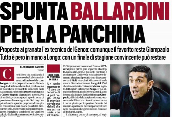 Stando a quanto riportato dall’edizione odierna di Tuttosport Longo al Torino resta in bilico. L’ex allenatore del Frosinone potrebbe essere allontanato a fine campionato. Per questo Cairo e Vagnati stanno continuando a guardarsi intorno. Nelle ultime settimane ai granata sarebbe stato proposto Davide Ballardini. Tecnico di Ravenna che ha vissuto le ultime esperienze sulla panchina del Genoa. Il nome dell’ex rosanero si unisce a quelli di D’Aversa, Pioli, Di Francesco, Maran, Giampaolo e Juric.
