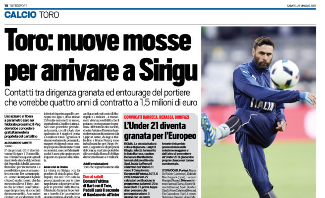 Tuttosport: “Toro: nuove mosse per arrivare a Sirigu. Ecco le richieste dell’ex rosa per tornare in Italia”