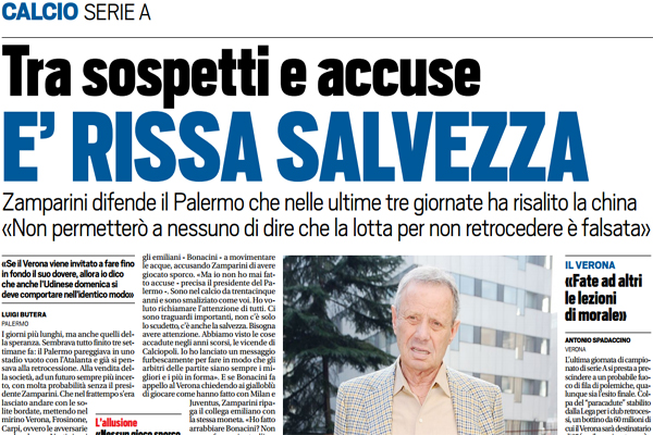 Tuttosport: “Tra sospetti e accuse è rissa salvezza. Zamparini difende il Palermo che nelle ultime tre giornate ha risalito la china: «Non permetterò a nessuno di dire che la lotta per non retrocedere è falsata»”