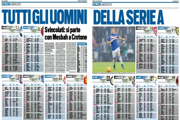 “Il mercato è finito, almeno nel senso letterale del termine: in Italia non si possono più acquistare giocatori. Le squadre, le cui rose vi mostriamo in queste due pagine, possono però essere ancora rafforzate: ingaggiando calciatori svincolati. Un’opportunità di cui il Crotone è stato il primo club di Serie A ad approfittare, con Djemel Mesbah: l’esterno sinistro franco-algerino aveva rescisso il suo legame con la Sampdoria proprio mercoledì e ieri ha firmato con la società calabrese. Il prossimo colpo dovrebbe piazzarlo il Verona: vicino Enzo Maresca. Il pezzo pregiato di questa appendice del mercato è Martin Caceres: il ventinovenne difensore uruguaiano è reduce dalla rottura del tendine d’Achille destro subita a febbraio e probabilmente è questa la causa del suo status di svincolato. Roma, Napoli, Fiorentina e Inter lo seguono, ma attendono il pieno recupero per affondare il colpo, anche perché l’uruguaiano chiede circa 2 milioni di ingaggio. Sembra invece aver rinunciato agli ingaggi da calciatore Daniel Osvaldo: ha annunciato ai media argentini di voler lasciare il calcio per la musica, rivelando di aver detto no al Chievo. Ha invece annunciato una pausa l’ex laziale Cana. Di no lo ha detto anche Bergessio al Palermo: «Non sono andato perché non ho voluto io!», il suo tweet polemico. Sempre in difesa, interessanti Marchese, che ha rescisso ieri col Genoa e il terzino sinistro spagnolo Enrique. A centrocampo occhio a Flamini (idea della Roma), Raul Meireles ed Emanuelson (gli ultimi due piacciono al Cagliari, Meireles può interessare anche al Milan), in attacco si può scommettere su Macheda, promessa finora non mantenuta, ma ancora venticinquenne”. Questo ciò che si legge sull’edizione odierna di “Tuttosport”.