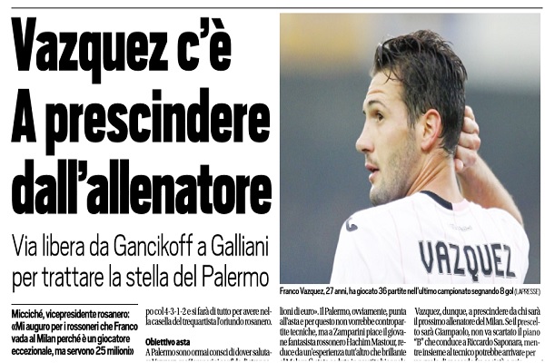 Tuttosport: “Vazquez c’è a prescindere dall’allenatore. Via libera da Gancikoff a Galliani per trattare la stella del Palermo”
