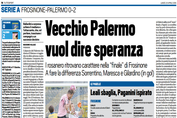“Colpaccio del Palermo che sbanca il Matusa e si aggiudica la sfida salvezza contro il Frosinone. I rosanero, che non vincevano da tre mesi (ultimo successo il 24 gennaio: 4-1 all’Udinese) sorpassano in classifica i ciociari, ora penultimi davanti al Verona, e agganciano momentaneamente il Carpi che stasera sarà impegnato a Modena contro l’Empoli. I siciliani tornano così a sperare, intravedono finalmente una luce in fondo al tunnel, dove erano precipitati dopo ben 13 partite senza vittorie (solo 5 pareggi). Per il Frosinone, che sperava nel fortino Matusa (22 punti conquistati sui 30 totali), il ko arriva in maniera quasi inattesa. I rosanero hanno saputo trovare il guizzo decisivo per rimettersi in gioco nella salvezza, quando mancano 270 minuti alla fine. In questa sorta di “mezzogiorno di fuoco” si è rivelata decisiva la vecchia guardia Maresca, Gilardino e Sorrentino. Addirittura i primi due sono stati schierati a sorpresa da Ballardini, che ha messo in campo un inedito 3-4- 2-1. Il Palermo ha finalmente messo in mostra il carattere e soprattutto è riuscito a far valere l’esperienza dei suoi uomini più rappresentativi. Gli applausi ai vinti Alla matricola ciociara è forse mancata quella vivacità e quella determinazione che si era vista in precedenza, soprattutto in casa. Comunque non tutto è perduto,anche se ora la strada verso la salvezza si è fatta in salita con il “muro” finale a Napoli. La sconfitta non ha però demoralizzato la tifoseria, che a fine gara ha chiamato più volte sotto la curva i propri beniamini con tanto di cori “Grazie ragazzi”. Con tutto lo stadio, in piedi, ad applaudire vincitori e vinti. Sono stati veramente dei momenti toccanti che, raramente, si vedono sui nostri campi, specie per partite dalla posta così alta. Certo non è stata una bella partita, in quanto la paura di perdere ha condizionato entrambe le contendenti. Così dopo un primo tempo senza emozioni, nella ripresa il gol di Gilardino in contropiede ha sbloccato la gara, proprio nel momento in cui il Frosinone stava prendendo l’iniziativa. E’ stata un’autentica doccia fredda per i canarini che però, dopo lo sbandamento iniziale nel quale hanno rischiato di subire il raddoppio, si sono ripresi, stringendo d’assedio l’area degli avversari. Sulla loro strada hanno però trovato il baluardo Sorrentino che ha blindato la propria porta. E nel finale, in contropiede, è arrivato il raddoppio del neo entrato Trajkovski. Amareggiato Stellone che, comunque, non si dà per vinto: «Questa sconfitta è pesantissima,ma finché la matematica non ci condanna ci proveremo.Devo ringraziare i giocatori che hanno dato tutto e i tifosi che a fine partita ci hanno applaudito. Peccato che loro hanno segnato ad inizio ripresa, proprio nel nostro momento migliore. Il gol di Gilardino era da annullare, in quanto la sua gamba era leggermente avanti». Euforico Ballardini: «Prestazione di carattere.Abbiamo giocato bene in una gara ricca di tensione per l’alta posta in palio. Mi conforta l’atteggiamento, abbiamo dimostrato che si può lottare fino alla fine per centrare la salvezza»”. Questo quanto si legge sull’odierna edizione di “Tuttosport” dopo la vittoria del Palermo sul Frosinone.