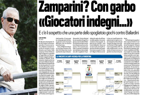 L’edizione odierna di “Tuttosport” analizza il momento buio del Palermo, attraverso le parole rilasciate ieri dopo il match perso contro l’Alessandria da Zamparini. Ecco quanto si legge: “«Oggi mi sono vergognato per come alcuni giocatori hanno espresso in campo la loro apatia. Portare la maglia rosa del Palermo deve essere un onore per qualsiasi giocatore perché è la maglia amata da una delle tifoserie migliori d’Italia. I giocatori che disprezzano con queste prestazioni la maglia non sono degni di essere più convocati a rappresentare i nostri colori. Prenderò i dovuti provvedimenti». – Il Palermo è di nuovo nel caos dopo l’esonero di Iachini. Ed è chiaro che c’era da aspettarselo dopo il disastro-Alessandria. Venire eliminati da una squadra di Lega Pro e giocare come ha fatto il Palermo nel primo tempo non poteva non provocare uno sconquasso. Durissime le parole di Zamparini dopo il match, parole che fanno malissimo allo spogliatoio. Il presidente fa capire che all’interno della squadra ci sia una lacerazione e che una parte remi contro Ballardini. Nomi non ne sono usciti, ma è facile capire che nel mirino di Zamparini ci siano un paio di senatori, con Maresca e Rigoni su tutti. Nel frattempo la squadra è stata coperta di fischi. E cori sono partiti anche contro lo stesso Zamparini”.