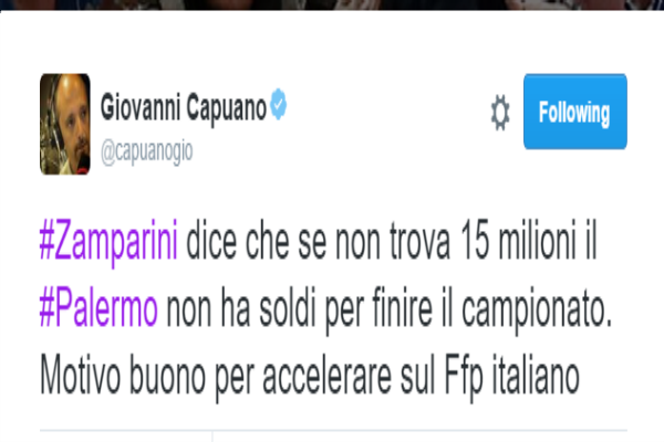 Attraverso il proprio profilo “Twitter”, il giornalista di “Panorama” Giovanni Capuano, commenta le dichiarazioni del patron rosanero Maurizio Zamparini riguardo i soldi da utilizzare per la società di viale del Fante: “Zamparini dice che se non trova 15 milioni il Palermo non ha soldi per finire il campionato. Motivo buono per accelerare sul Ffp italiano”. In alto, la foto del tweet in questione.
