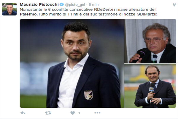Attraverso il proprio profilo Twitter, il giornalista Maurizio Pistocchi scrive il motivo per cui De Zerbi, nonostante la serie di sconfitte di fila, sia rimasto nella panchina rosanero: “Nonostante le 6 sconfitte consecutive Roberto DeZerbi rimane allenatore del Palermo.Tutto merito di Tullio Tinti e del suo testimone di nozze Gianluca Di Marzio“. In alto, la foto del tweet in questione.