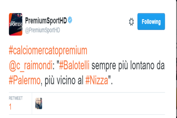 Con queste parole sulla propria pagina Twitter, Premium Sport commenta il possibile avvicinamento del Palermo al centravanti Mario Balotelli: “Balotelli sempre più lontano da Palermo, più vicino al Nizza”. In alto, la foto del tweet in questione.