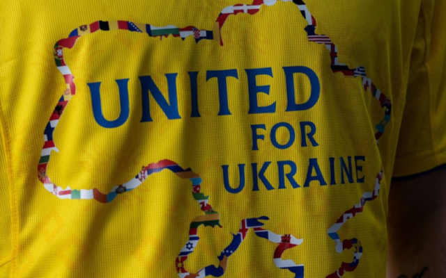 Al centro è presente lo slogan “United for Ukraine” mentre sopra di essa è stato applicato il logo di U24, la coalizione contro la guerra proposta dal presidente Volodymir Zelensky.