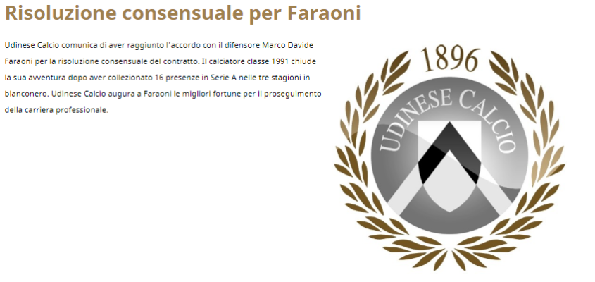 “Udinese Calcio comunica di aver raggiunto l’accordo con il difensore Marco Davide Faraoni per la risoluzione consensuale del contratto. Il calciatore classe 1991 chiude la sua avventura dopo aver collezionato 16 presenze in Serie A nelle tre stagioni in bianconero. Udinese Calcio augura a Faraoni le migliori fortune per il proseguimento della carriera professionale”.