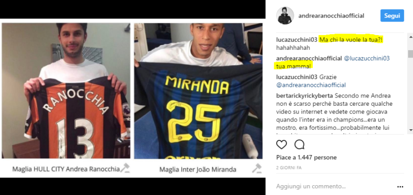 Il difensore Andrea Ranocchia ha messo all’asta su “Instagram” una sua maglia dell’Hull City. Dopo la pubblicazione si è scatenata l’ironia dei tifosi che hanno preso in giro l’ex Sampdoria: “Ma chi la vuole la tua?! hahahhahah”. Il centrale cresciuto nell’Arezzo, però, ha risposto a tono: “Tua mamma”. Ecco in basso la foto: