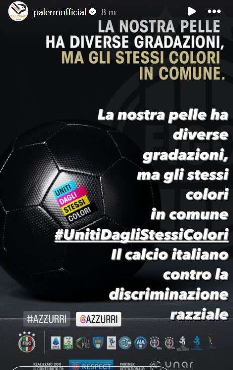 Attraverso le Instagram stories il Palermo si unisce alla lotta contro il razzismo: “La nostra pelle ha diverse gradazioni ma gli stessi colori in comune. #Unitidaglistessicolori. Il calcio italiano contro la discriminazione razziale”.