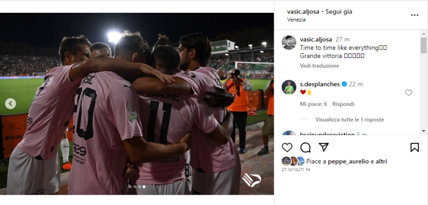 Venezia-Palermo, Vasic esulta sui social: “Grande vittoria!” (FOTO)