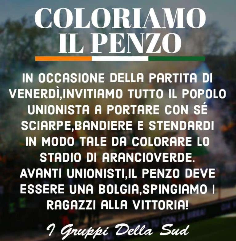 “In occasione della partita di venerdì, invitiamo tutto il popolo unionista a portare con sè sciarpe, bandiere e stendardi in modo tale da colorare lo stadio di arancioverde. Avanti unionisti, il Penzo deve essere una bolgia. Spingiamo i ragazzi alla vittoria!”.