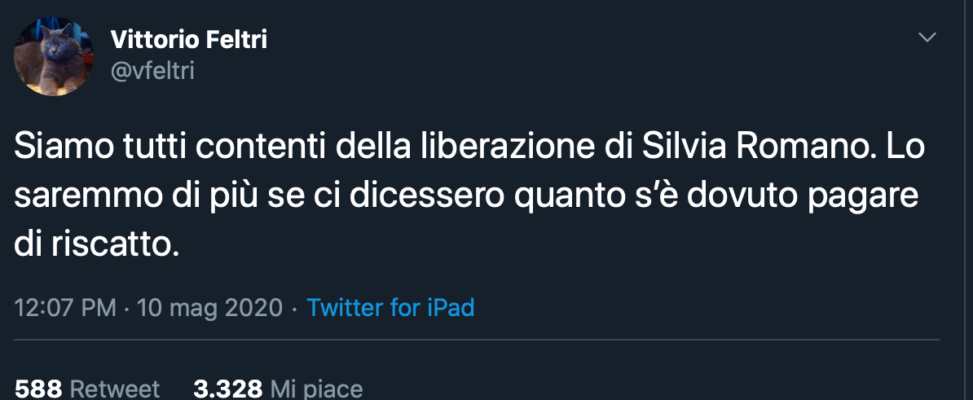 Si parla ancora del direttore di Libero, Vittorio Feltri, stavolta protagonista di un tweet provocatorio nei confronti dello Stato in merito alla liberazione di Silvia Romano. “Quanto ci è costato pagare il riscatto di Sivila Romano?” – ha scritto Feltri -, e puntuale sono arrivati gli insulti su Twitter: