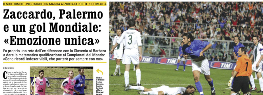 L’edizione odierna de “Il Corriere dello Sport” riporta una lunga intervista all’ex rosanero Cristian Zaccardo il quale ha parlato dell’Italia che questa sera affronterà la Macedonia al “Barbera”, soffermandosi anche sul gruppo di calciatori rosanero di cui ha fatto parte che nel 2006 hanno partecipato alla spedizione al Mondiale poi vinto dalla formazione di Lippi.