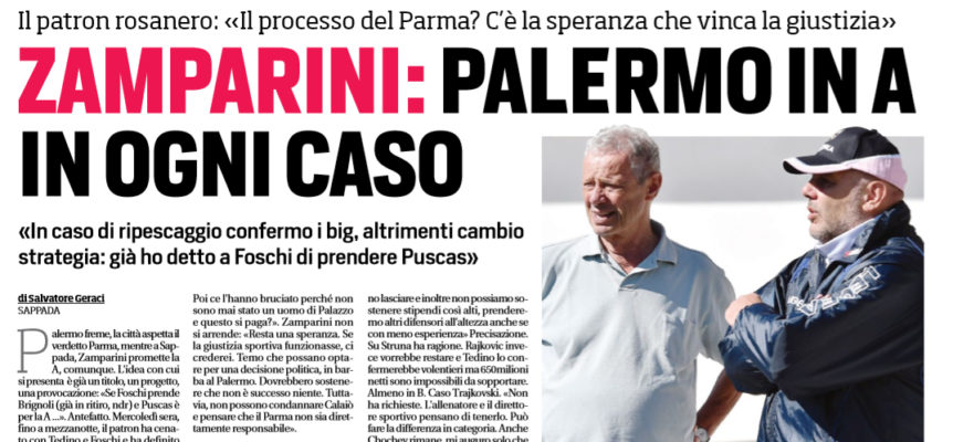 “Palermo freme, la città aspetta il verdetto Parma, mentre a Sappada, Zamparini promette la A, comunque. L’idea con cui si presenta è già un titolo, un progetto, una provocazione: «Se Foschi prende Brignoli (già in ritiro, ndr) e Puscas è per la A …». Antefatto. Mercoledì sera, fino a mezzanotte, il patron ha cenato con Tedino e Foschi e ha definito la doppia strategia di mercato, A diretta e B. Ieri, invece, ha affrontato gli umori della squadra, dopo una lunga passeggiata con Foschi dal sapore di “abbiamo dimenticato nulla?”. Lo stesso ha fatto con Tedino. Poi la scena diventa un teatrino ricco di battute e significati. Passa Rispoli e il patron, tra il pungente e l’ironico lo apostrofa: «In serie A, nel tuo ruolo, li cercano a 25, 27 anni …». E gli da una pacca sulla spalla come dire che scherzava. Con Gnahoré solo sorrisi, segno che la sua riconferma non è più in discussione. E quando arriva Pomini si respira aria di gelo. Si saluteranno? Pomini educatamente fa la prima mossa, Zamparini risponde e il portiere, scavalcato nelle gerarchie da Brignoli, allunga la mano per una stretta che dura un attimo. A? Non cederemo giocatori importanti. Ci servirebbero almeno quattro elementi. E li abbiamo in casa (Nestorovski, Jajalo, Struna, Rajkovic, ndr). Sarà comunque il Palermo di Tedino e Foschi, con entusiasmo e giocatori di qualità. In B, Rino costruirebbe una squadra per la promozione, non per salvarci». E Rispoli? «Vuole andar via, lo accontenteremo. Però gli ho chiesto: «E in caso di A?». «Cambierebbe lo scenario», ha risposto. Anche Nestorovski sarebbe in partenza. Ha quattro richieste: due squadre inglesi, una italiana e una turca. In quanto a Jajalo, cercano di approfittare dei calciatori in scadenza. Abbiamo programmato di ridurre i costi della squadra, non avendo il paracadute. E anche di acquistare giovani affamati». «Rajkovic e Struna vogliono lasciare e inoltre non possiamo sostenere stipendi così alti, prenderemo altri difensori all’altezza anche se con meno esperienza» Precisazione. Su Struna ha ragione. Rajkovic invece vorrebbe restare e Tedino lo confermerebbe volentieri ma 650 mila euri netti sono impossibili da sopportare. Almeno in B”.